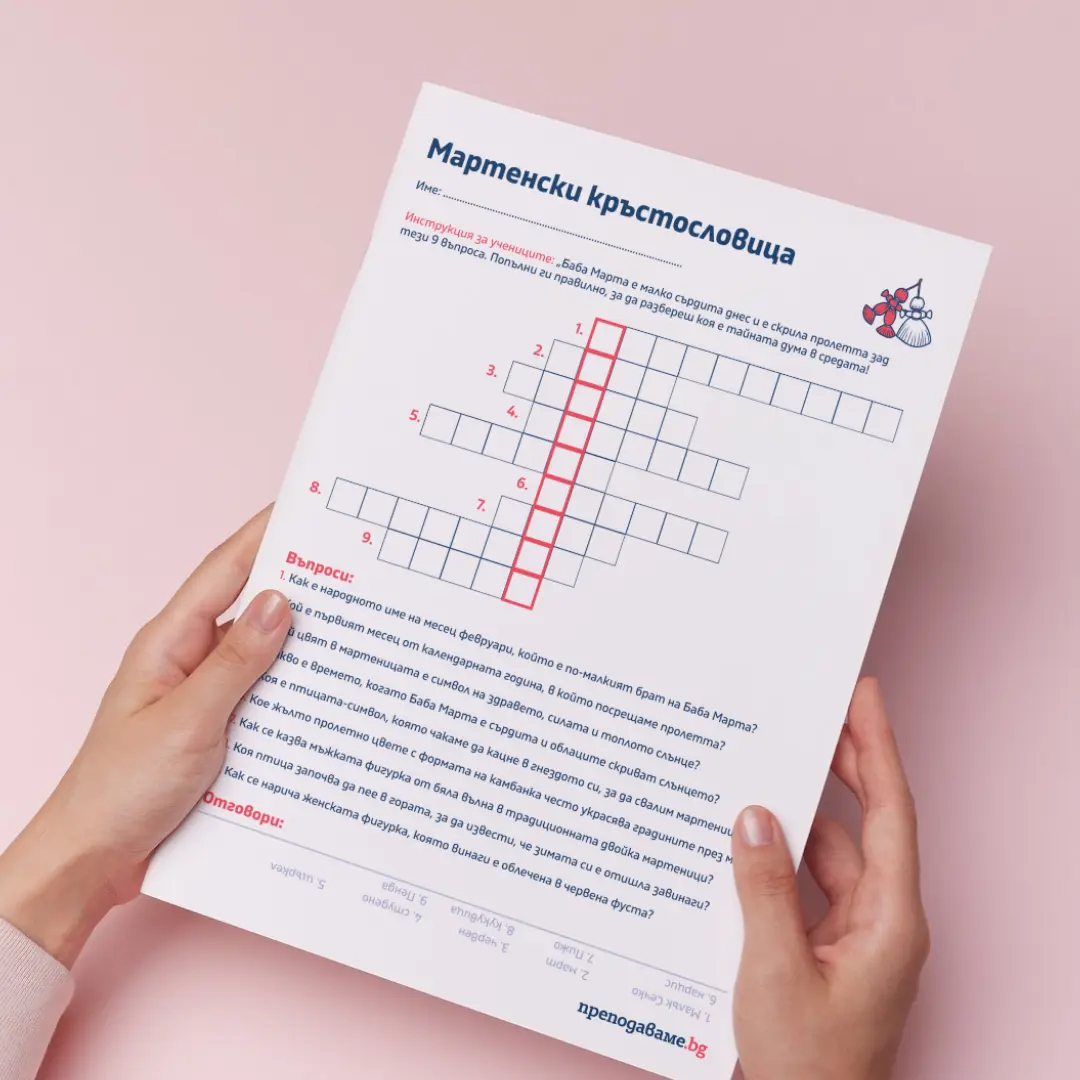 Кръстословицата включва 9 ключови въпроса, свързани с фолклора, пролетните вестители и символиката на мартеницата. Тя е проектирана така, че при правилно попълване, учениците да открият вертикалната тайна дума — МАРТЕНИЦА.