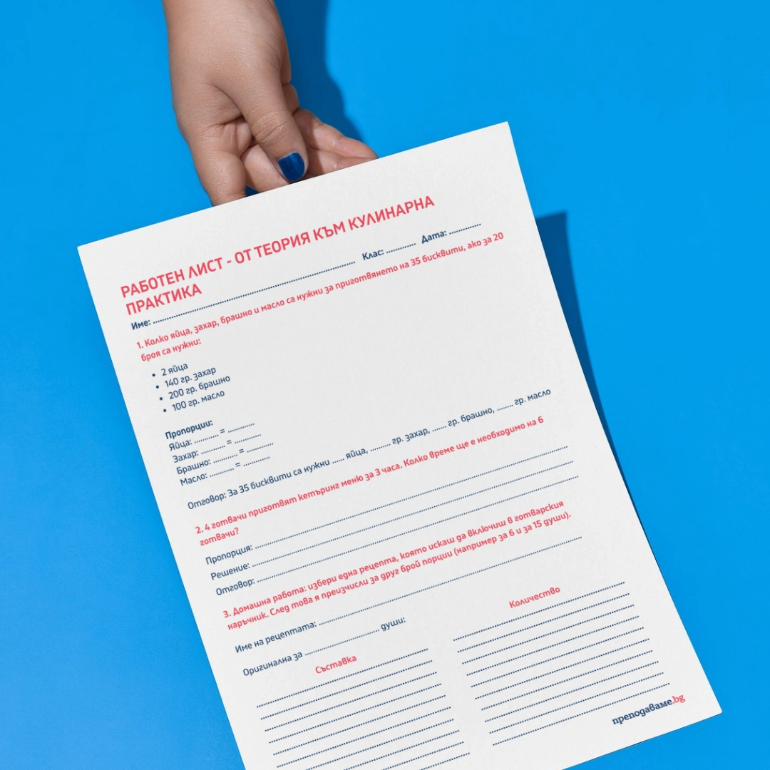 Работен лист към урок „От теория към кулинарна практика“ (Урок 4, от ПБО № 3 „Тайната на перфектната рецепта“ по Математика за 6. клас). Чрез задачите учениците прилагат знания за права и обратна пропорционалност при решаване на практически казуси, свързани с рецепти и организация на работа. Акцентът е върху самостоятелното записване на пропорции, намиране на неизвестни величини и рефлексия върху процеса на учене.