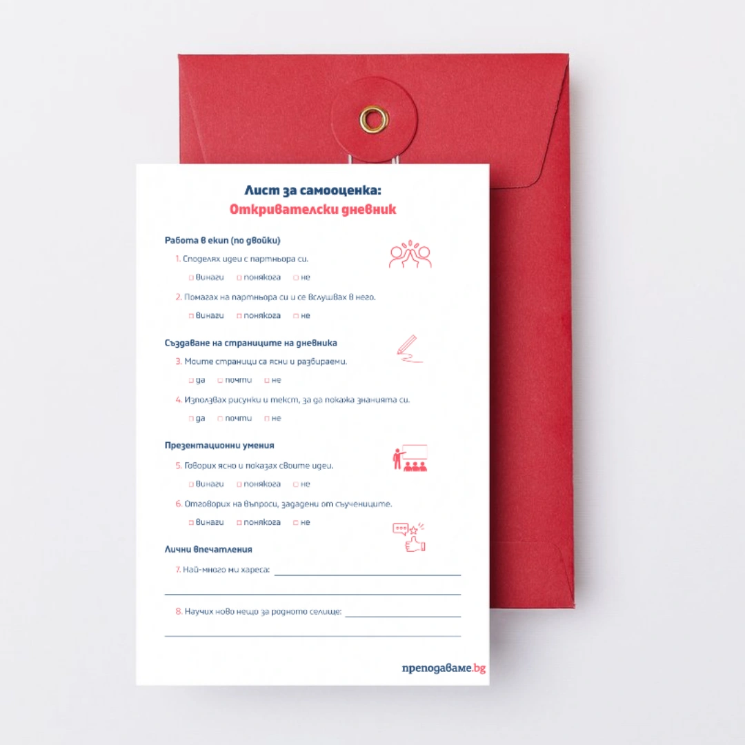 • Вземете листа за самооценка „Откривателски дневник“. На него има различни твърдения. За всяко едно от тях отбележете дали е вярно, почти вярно или не важи за вас. Най-отдолу споделете какво най-много ви хареса в проекта и какво ново научихте.”