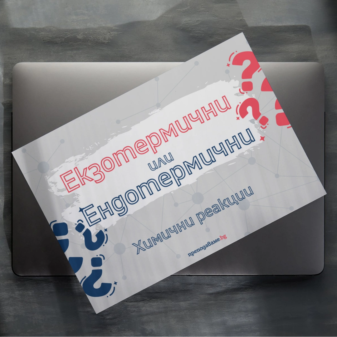 • “Ще започнем днешния час с една кратка игра. Ще раздам на всяка работна група по едно синьо и едно червено картонче, след което ще ви покажа няколко термохимични реакции, които често използваме в нашето ежедневие. В рамките на 30 секунди всеки екип трябва да определи дали дадената реакция е ендотермична или екзотермична. Можете да си помагате със заданията, които ви дадох за домашна работа предишния час. В зависимост от вашия избор трябва да покажете едното от двете картончета – синьо за ендотермична реакция или червено – за екзотермична.”