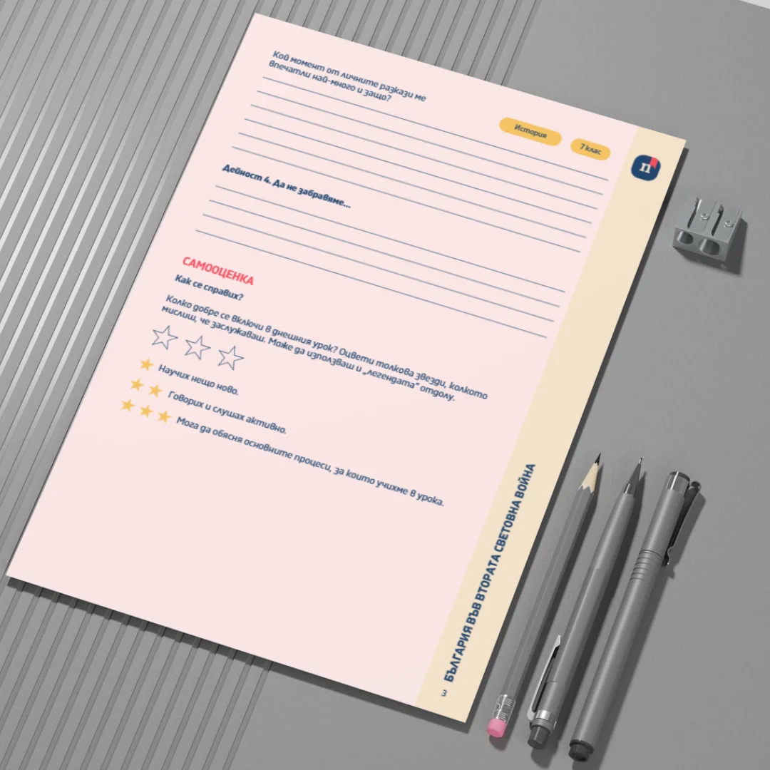 Този работен лист е част от урока „България във Втората световна война“ (Урок 22 по История за 7. клас). Чрез работа с исторически свидетелства и творчески задачи учениците изследват участието на България във войната и проследяват как събитията от периода се отразяват върху живота на хората. Работният лист насърчава учениците да анализират разкази на очевидци и да разгледат историческите събития през човешката перспектива.