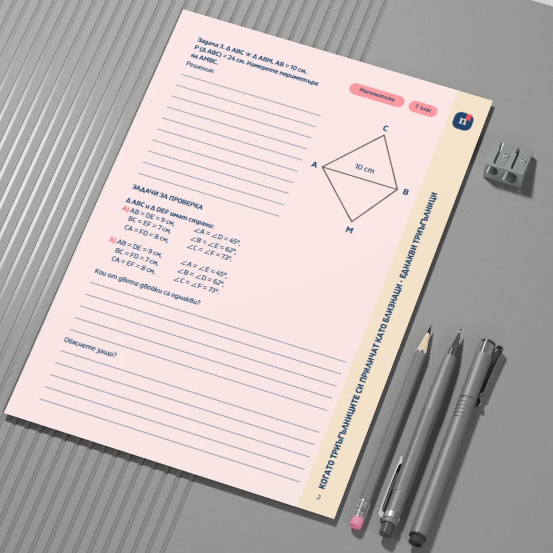 Този работен лист е част от урока „Еднакви триъгълници“ (Урок 52 по Математика за 7. клас). Чрез разнообразни задачи учениците разпознават еднакви триъгълници по дадени елементи, установяват съответствия между страни и ъгли и обосновават изводи за тяхната еднаквост. Работният лист насърчава логическо разсъждение и аргументирано представяне на решения.