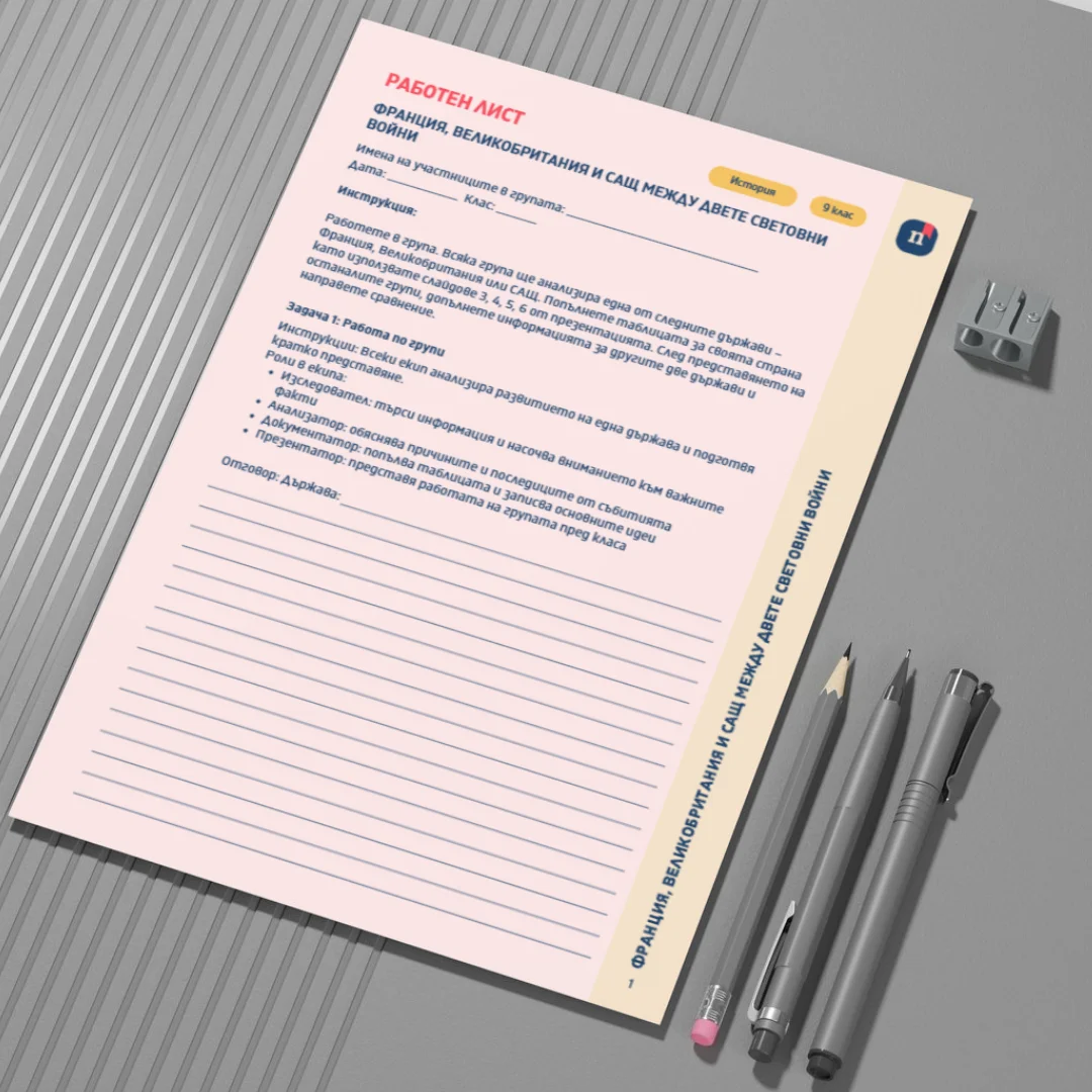Този работен лист е част от урока „Франция, Великобритания и САЩ между двете световни войни“ (Урок 7 по История за 9. клас). Чрез структурирани задачи учениците изследват политическите и икономическите особености на трите демокрации и оценяват тяхната устойчивост при международни и икономически кризи.