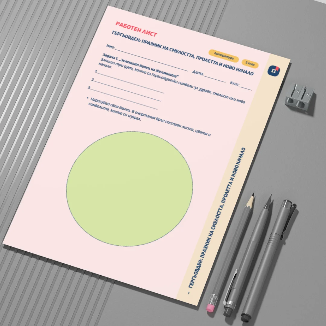 Този работен лист е част от урока „Гергьовден – празник на смелостта, пролетта и ново начало“ (Урок 6 по Литература за 5. клас). Чрез творчески задачи учениците осмислят символиката на празника и свързват традиционните образи със съвременни ценности и лични послания. Работният лист насърчава въображението, писменото изразяване и интерпретацията на културни символи.