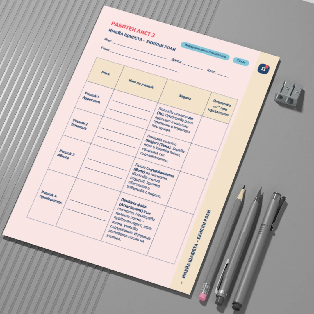 Този работен лист е част от урока „Изпращане и получаване на електронно писмо“ (Урок 7 по Компютърно моделиране и информационни технологии за 5. клас). Чрез практически задачи учениците упражняват създаването, изпращането и получаването на електронни писма, като прилагат знанията си в реална дигитална комуникация. Работният лист насърчава спазването на етични правила и безопасно поведение при използване на електронна поща.