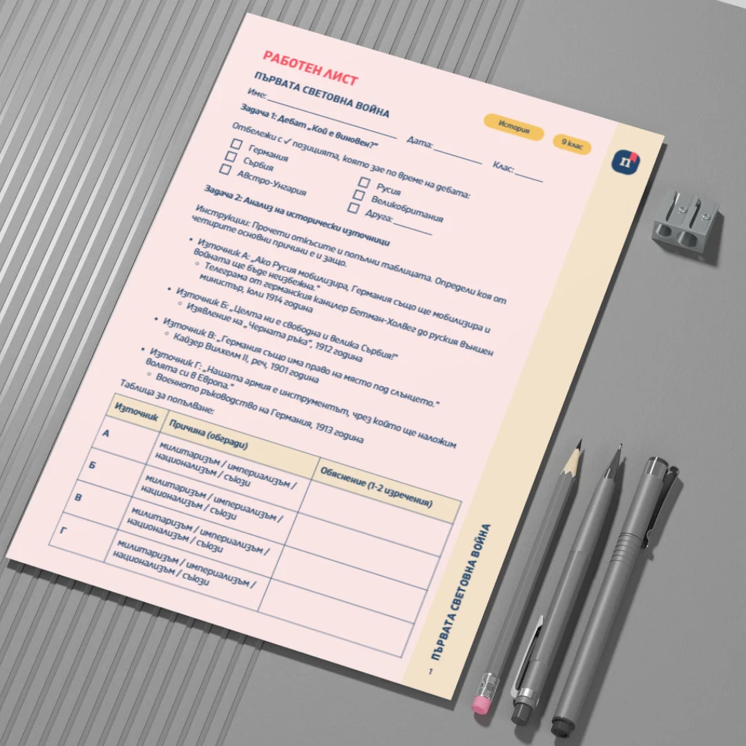 Този работен лист е част от урока „Първата световна война“ (Урок 3 по История за 9. клас). Чрез разнообразни задачи учениците изследват причините, хода и последиците от Първата световна война, като анализират различни исторически интерпретации за отговорността за конфликта. Работният лист насърчава учениците да проследят ключовите събития от периода 1914-1918 г., да ги подредят в хронологичен ред и да формулират аргументирана позиция за факторите, довели до избухването на войната.