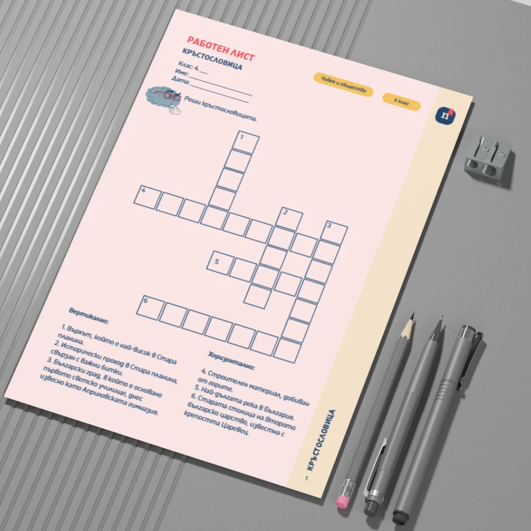 Този работен лист е част от урока „Пътешествие из Старопланинската област“ (Урок 3 по Човекът и обществото за 4. клас). Чрез игрови и познавателни дейности учениците изследват природните особености, населените места и стопанските дейности в Старопланинската област, като развиват умения за работа с карта и пространствено ориентиране.
