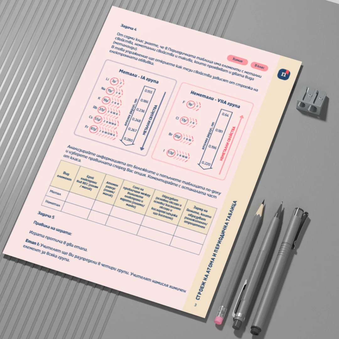 Този работен лист е част от урока „Строеж на атома и Периодична таблица“ (Урок 2 по Химия за 8. клас). Чрез разнообразни задачи учениците анализират връзката между строежа на атома и мястото на химичните елементи в Периодичната таблица. Работният лист подпомага откриването на закономерности в изменението на атомните радиуси и свързването на електронната обвивка със свойствата на елементите.