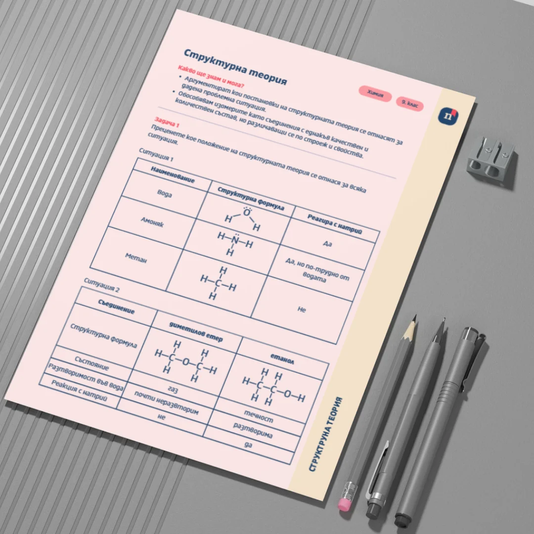 Този работен лист е част от урока „Структурна теория“ (Урок 9 по Химия за 9. клас). Чрез разнообразни задачи учениците прилагат основните положения на структурната теория за анализ на проблемни ситуации, свързани със строежа и свойствата на органичните вещества. Работният лист подпомага разбирането на връзката между структурата на молекулите и техните свойства, както и разпознаването на изомерията.