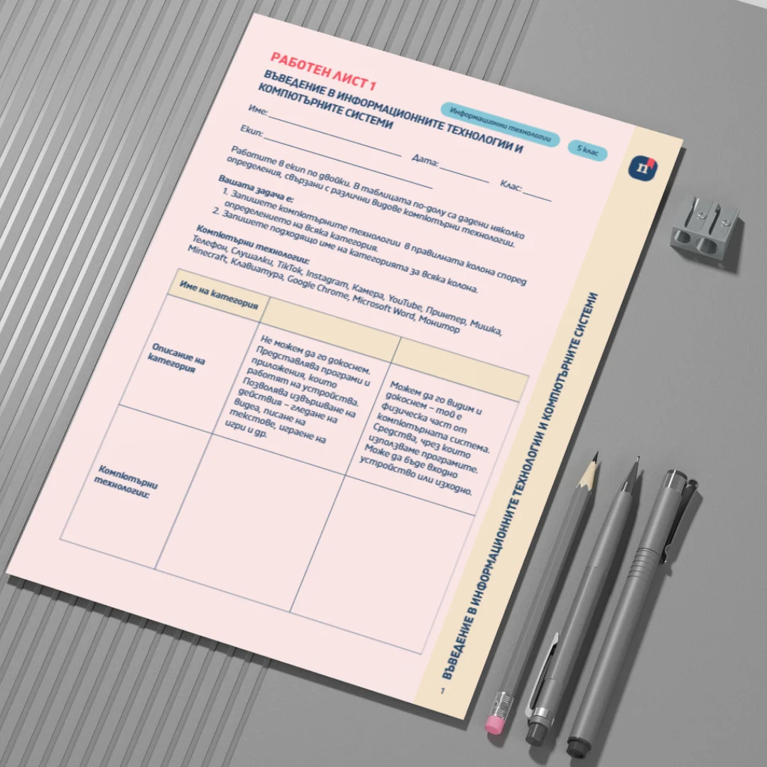 Този работен лист е част от урока „Въведение в информационните технологии и компютърните системи“ (Урок 1 по Компютърно моделиране и информационни технологии за 5. клас). Чрез практическа задача учениците се запознават с основните понятия в информационните технологии и разбират как компютърните системи се използват в ежедневието. Работният лист насърчава работата в екип, логическото мислене и умението за класифициране на различни видове компютърни технологии.