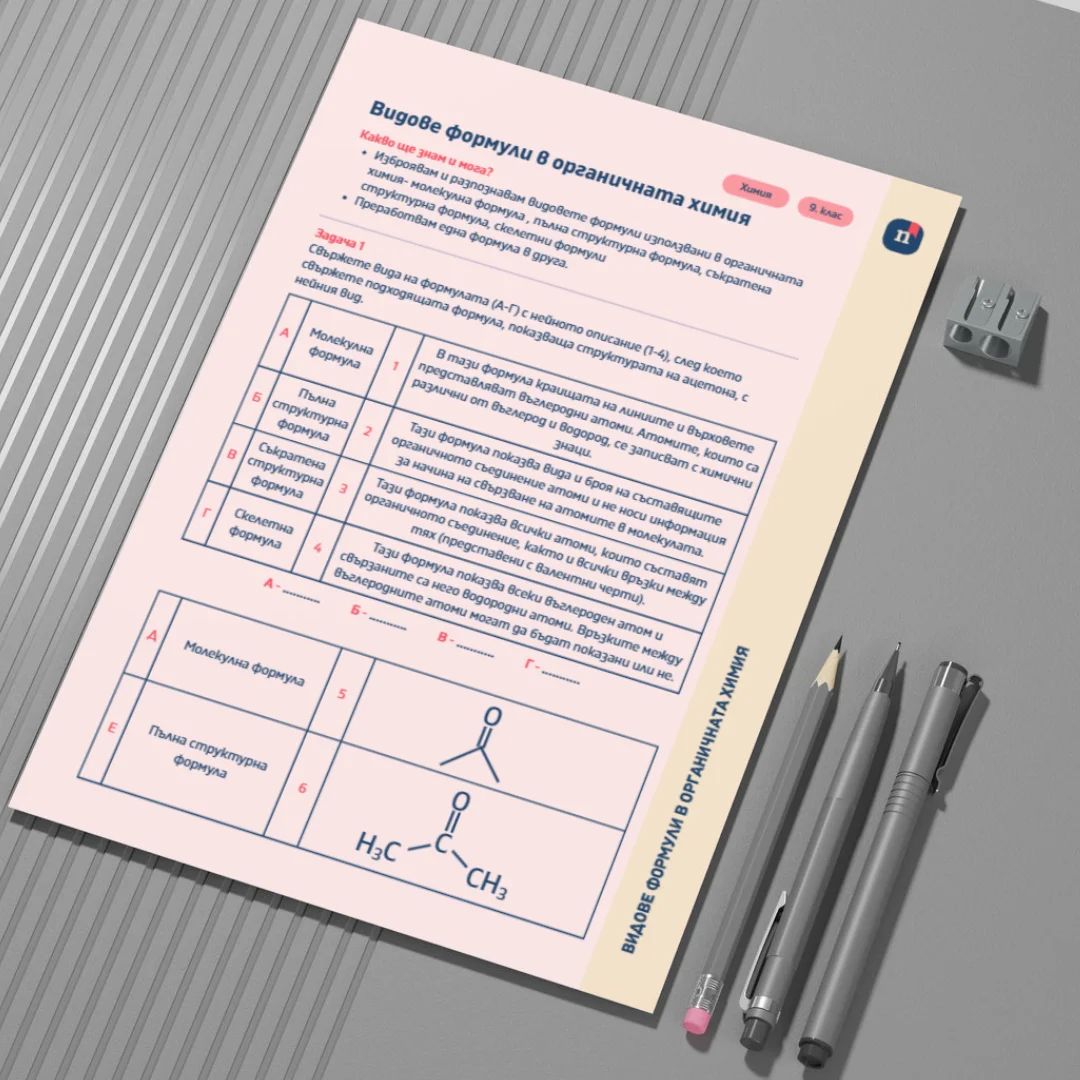 Този работен лист е част от урока „Видове формули в органичната химия“ (Урок 10 по Химия за 9. клас). Чрез разнообразни задачи учениците изследват различните начини за представяне на органичните съединения и анализират връзката между молекулни, структурни и скелетни формули. Работният лист насърчава прилагането на знанията чрез преобразуване между различни видове формули и анализ на структурата на органични молекули.