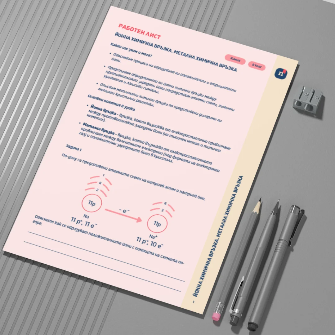 Този работен лист е част от урока „Йонна връзка. Метална връзка“ (Урок 5 по Химия за 8. клас). Чрез разнообразни задачи учениците изследват процесите на отдаване и приемане на електрони и анализират образуването на положителни и отрицателни йони. Работният лист подпомага разбирането на йонната връзка и нейното представяне чрез различни модели, както и разглеждането на особеностите на металната връзка.
