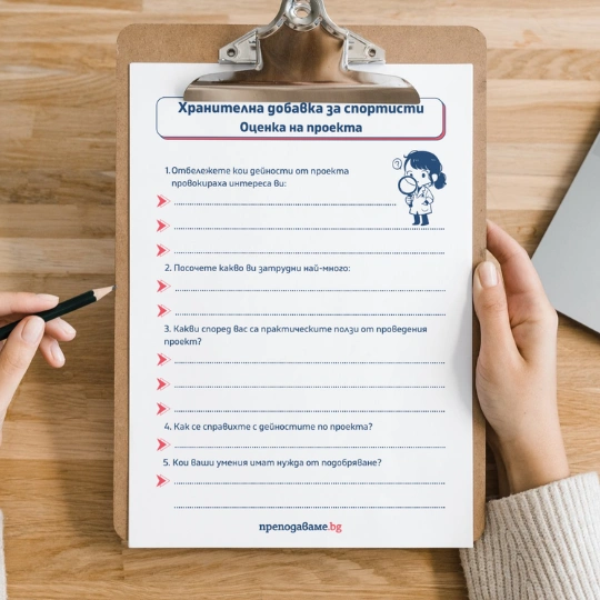 Работен лист към урок “Нашата хранителна добавка – представяне и оценка” (Урок 4, от ПБО № 9 “Хранителна добавка за спортисти” по Химия за 9. клас). Чрез предоставените въпроси учениците извършват саморефлексия върху работата си по проекта за създаване на хранителна добавка за спортисти. Работният лист помага за критичен преглед на придобитите знания и практическия опит в областта на приложната химия.