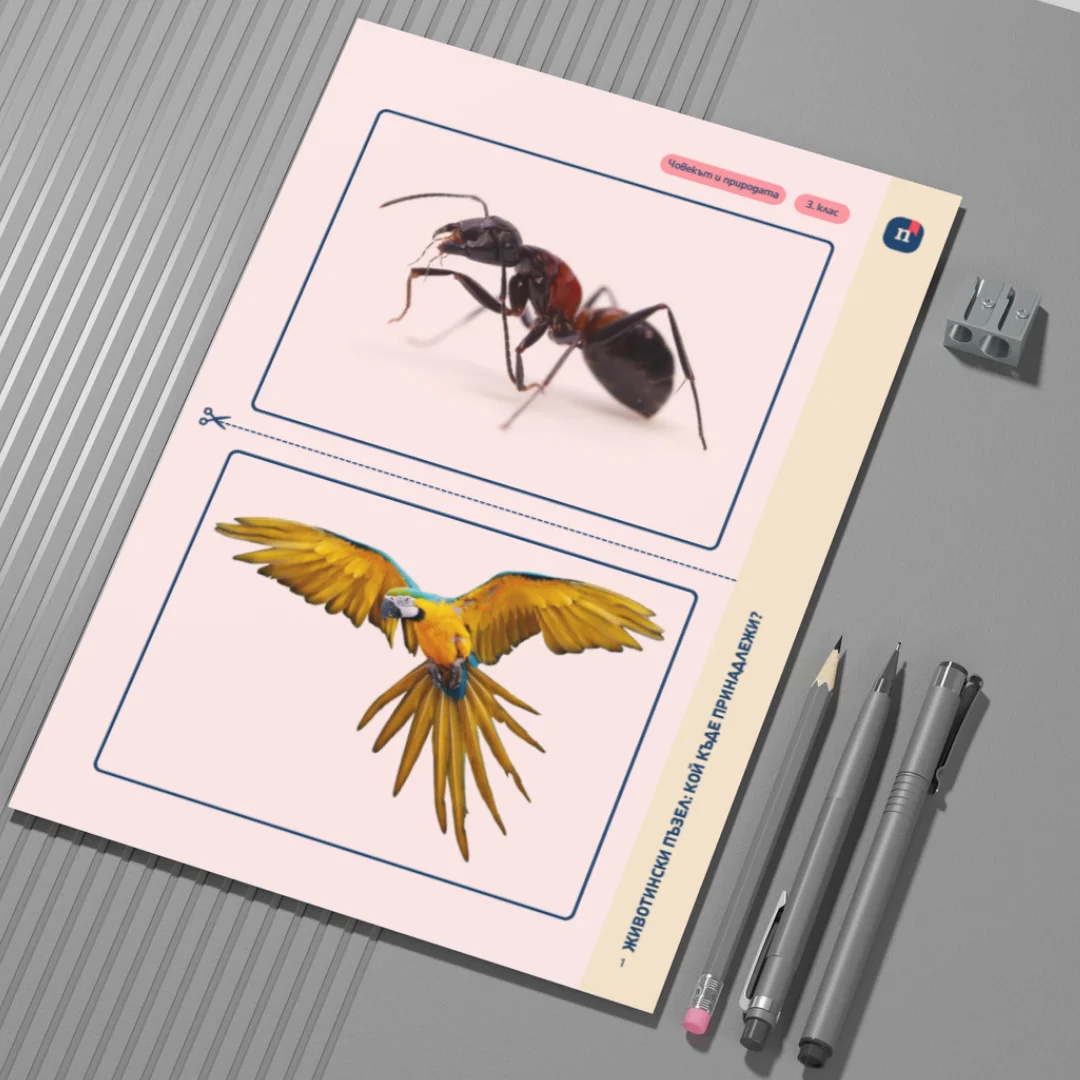 Този работен лист е част от урока „Животински пъзел: Кой къде принадлежи?“ (Урок 17 по Човекът и природата за 3. клас). Чрез разнообразни задачи учениците разпознават основните групи сухоземни животни, класифицират ги според техните отличителни белези и свързват характеристиките им с принадлежността към дадена група. Задачите насърчават наблюдение, анализ и логическо мислене.