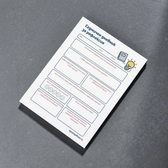 Работният лист Седмичен дневник за рефлексия насърчава учениците да мислят осъзнато за изминалата седмица и да развиват умения за самооценка и личностно развитие. Чрез въпроси като „Коя беше най-хубавата част от седмицата ти?“ и „Какво ново нещо научи?“ децата споделят преживяванията си, трудностите, успехите и целите си за следващата седмица. Подходящ е за час на класа, наставнически разговори или индивидуална рефлексия.