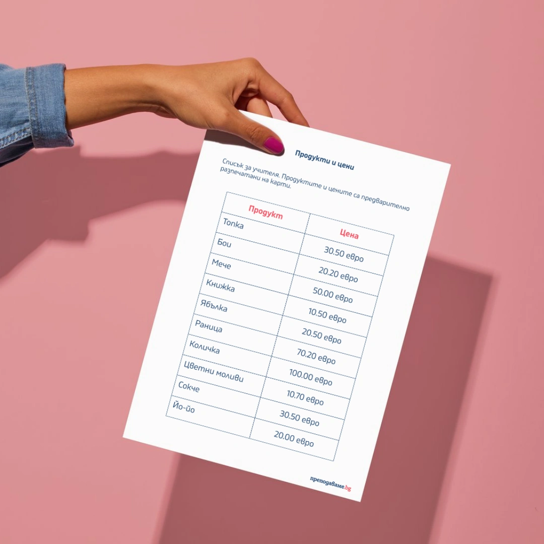 Работният лист може да бъде редактиран и адаптиран според нуждите на вашия клас чрез Canva шаблона тук: Шаблон, Списък с продукти и цени
