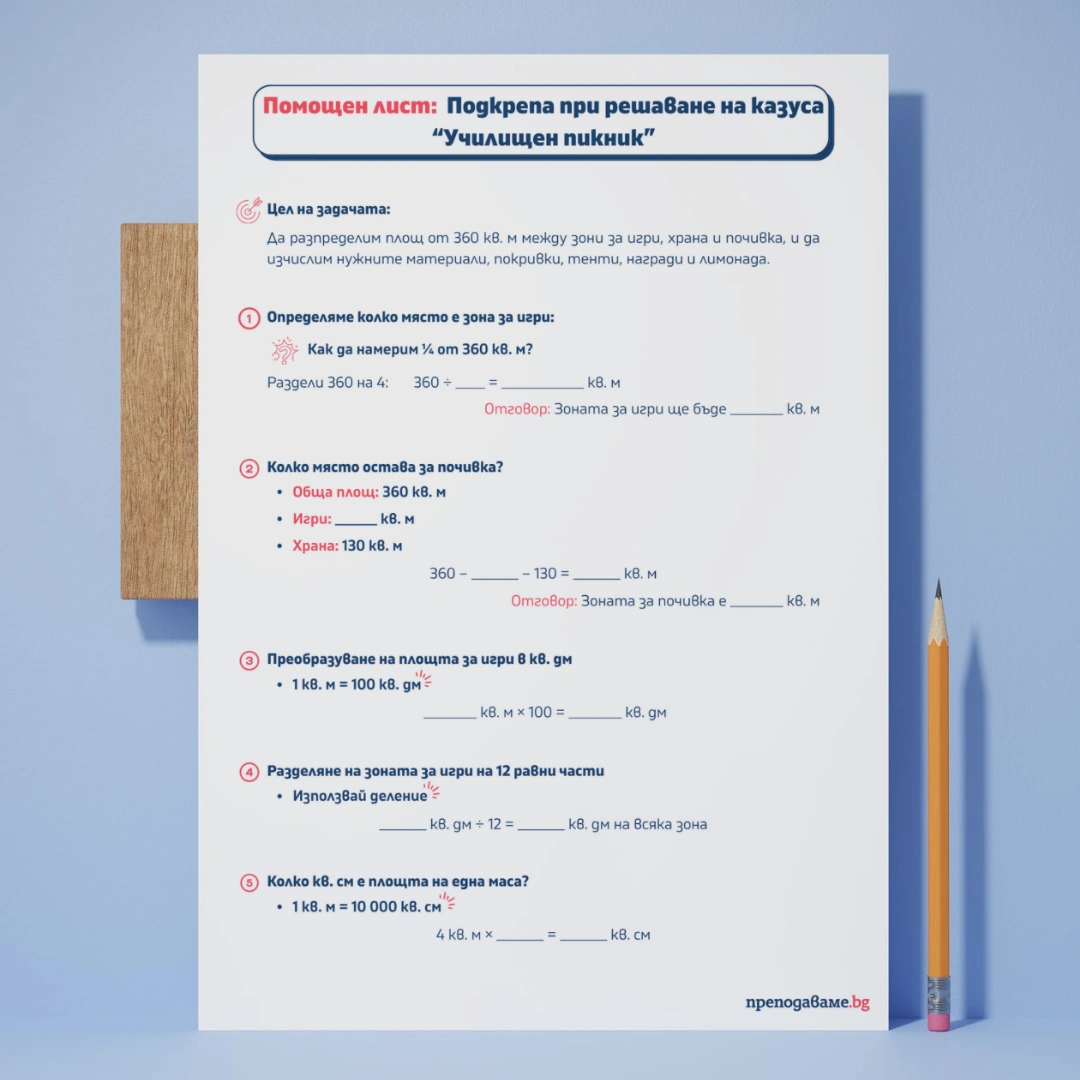 • За учениците, които изпитват неувереност и предизвикателство, дайте лист с подкрепяща структура – помощен лист при решаване на казуса “Училищен пикник”
