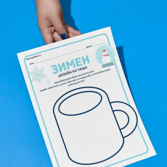 Работният лист „Зимен дизайн на чаша“ е творческо занимание, което насърчава въображението и артистичността на учениците. Задачата е да нарисуват свой уникален дизайн върху изображение на чаша, като използват любимите си зимни цветове. Подходящ е за час по изобразително изкуство, занимания по интереси или като забавна сезонна активност в клас.